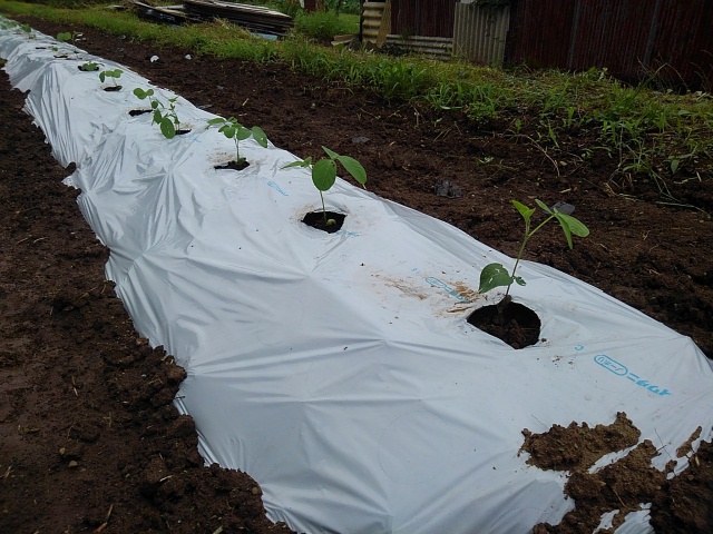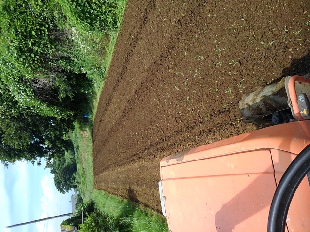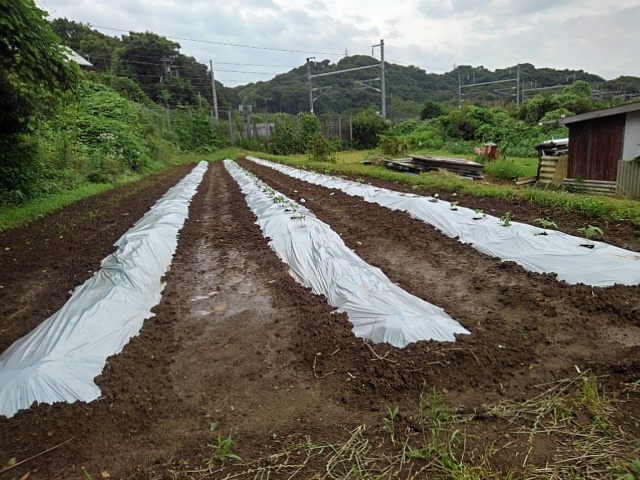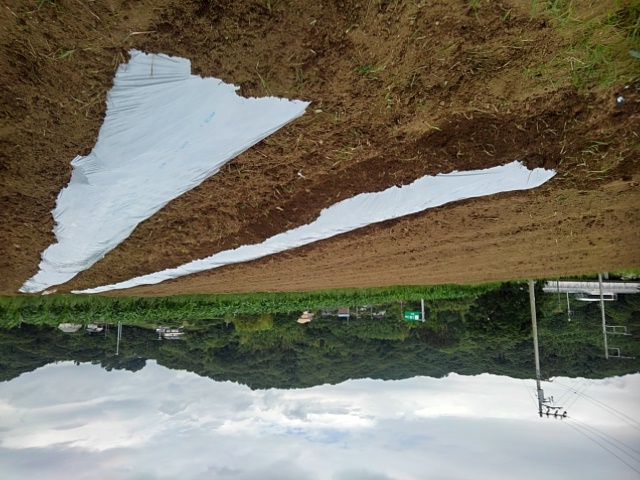ポッドで育苗中の黒豆苗が成長したのと晴れ間が覗いたので黒豆圃場の第3圃場と第5圃場を22馬力トラクターでうなり、畦を作って白黒マルチ(穴付き)を布設して第3圃場の一部の畦に黒豆を定植しました。
