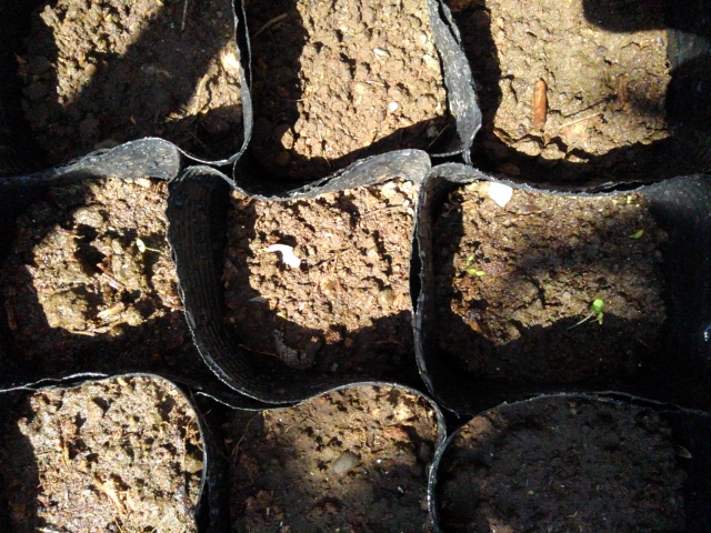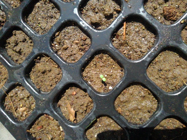 3月16日に植えたマカの内、育苗箱とポッドのマカがそれぞれ2−3本ほど芽が出てきました。