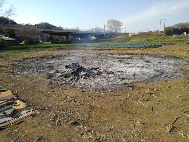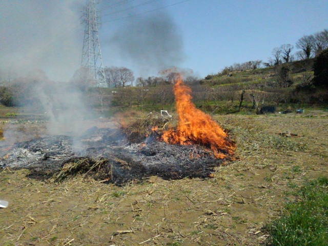 周辺の切株、枝、竹、笹他を浜田さんと二人でモロコシ畑で燃やしました。浜田さんが消防署に届けて許可を貰っています。13:30−16:30までのの3時間で焼けつくしました。