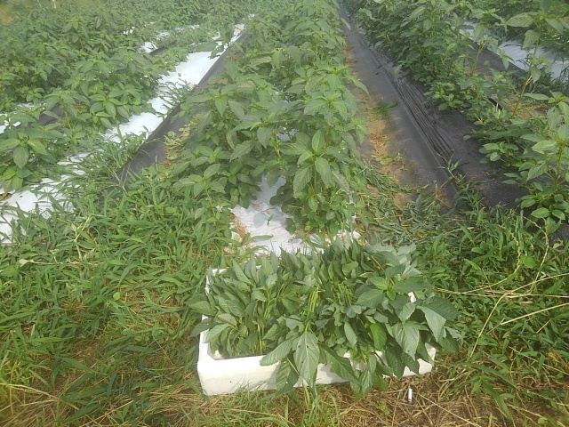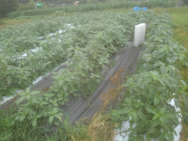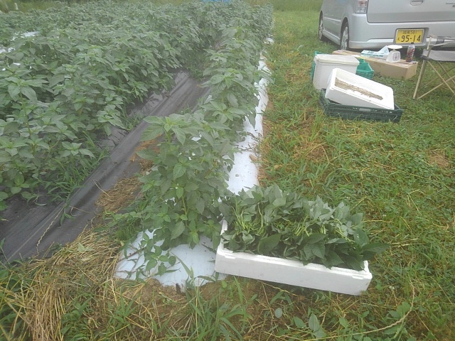 | 6/28モロヘイヤの初収穫と出荷/First harvest and shipment of Morohaya | | | |  | 7月初めの出荷を予定していましたが、予想外に成長が早く第三圃場のモロヘイヤを収穫しました。100gのモロヘイヤの束を袋に入れます。この袋が72個になりました。早速70袋を秦野の市場に出荷しました。2袋は業務用冷蔵庫に温度18度で保存しました。 Though planed to ship it in early July, but it grew unexpectedly fast.So,harvested Moroheiya from the third field. Put a bunch of 100g Moroheiyas of 100g in wieght into a vinyl bag. Harvested 72 bags. Immediately shipped 70 bags to the Hadano market. Two bags were stored in a commercial refrigerator at a temperature of 18 degrees. |