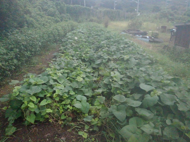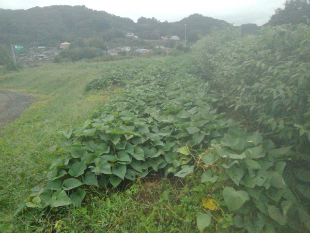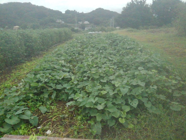 早朝から雨が降ったので、午後圃場の様子を見てから第五圃場のサツマイモの畑の蔓を返しました。これは伸びた蔓の不定根を外して蔓がレ(芋より蔓葉ばっかり大きくなること)を防ぐ為です。