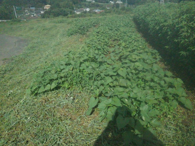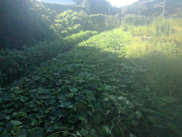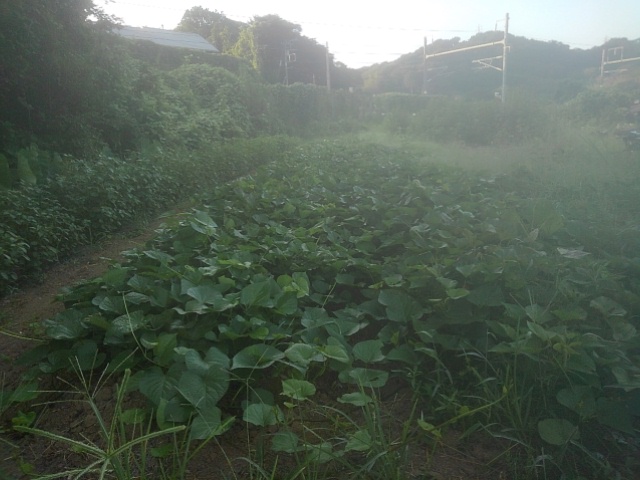 朝畑の様子をチェックしました。畦間や畦を一杯に蔓が伸びていました。後日蔓返しをします。