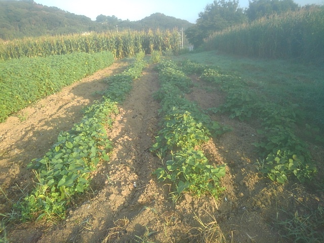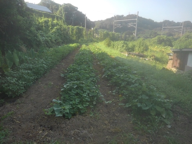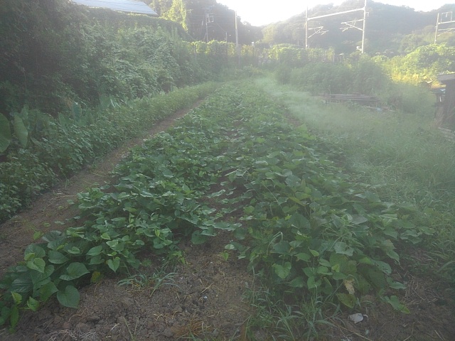 第三圃場のサツマイモ畑も追肥の漉き込みをしました。第五圃場のサツマイモは新たに蔓葉が伸び始めて畦間の空白を埋めています。