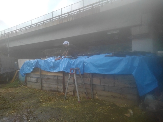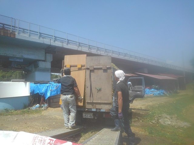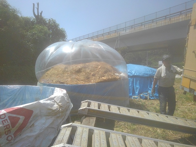 一日休んで本日から丸型サイロへのサイレージが始まりました。2tトラック2.5-3台分のモロコシ飼料が収納されます。発酵促進粉をまぶします。翌日にはガスが溜まり膨れ上がります。