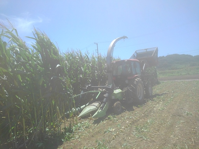 いつもは盆明けですが、今年は昨年のサイロ飼料が早くなくなりそうなので早めの仕込みとなりました。県道沿いのモロコシ畑の収穫とサイロ詰めを手伝いました。私は入口のモロコシの鎌でのカットとハ―ベスタへのfeedやサイロ詰めの際のforkでの詰め込みや固めなどの雑用です。