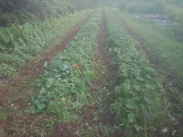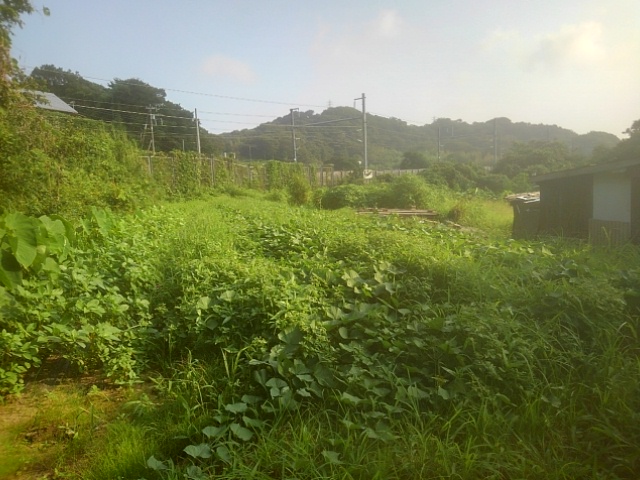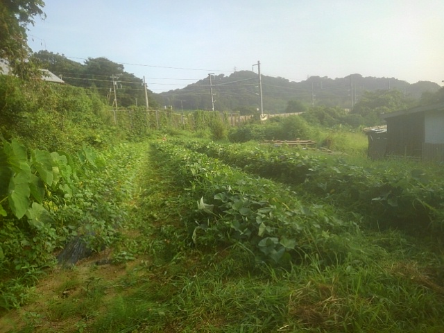 長梅雨で草刈りが出来なかった第五圃場の草刈りと簡易耕運機での畦間の中耕を実施しました。この畑にはモロヘイヤとサツマイモを植えています。サツマイモの蔓が雑草で隠れていましたがやっと剥き出しになりました。今後の成長を期待します。