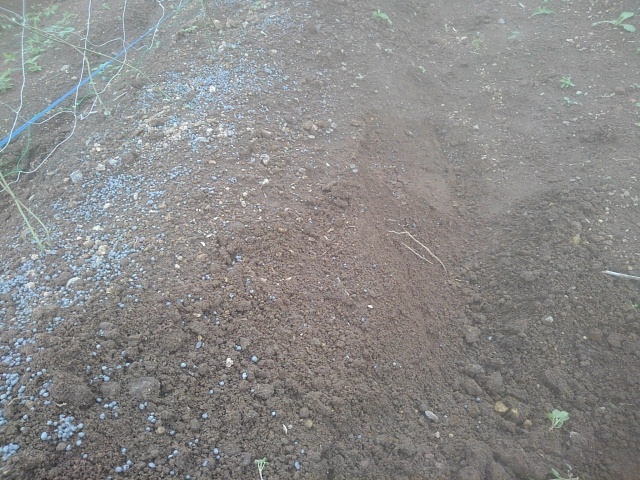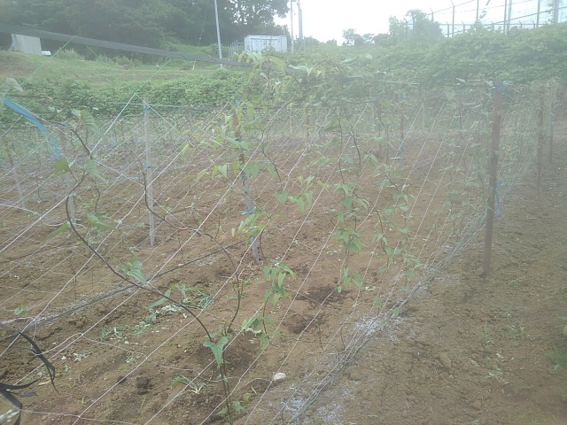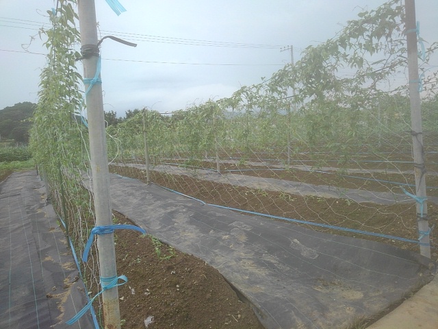 早朝に第一圃場の蔓葉の養生、草取りをして最後に化成肥料(8-8-8)を追肥しました。(約40Kg)