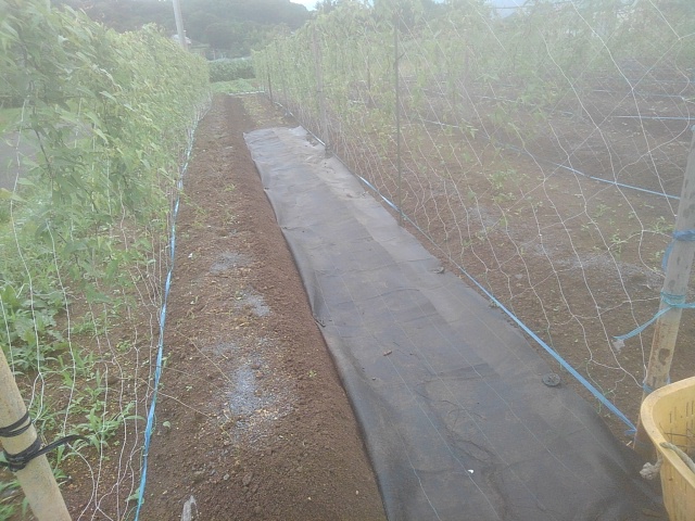 残りの畦間9計10畦間の防草シートの布設を完了しました。これで今後の草取りは畦上だけで済むことになります。