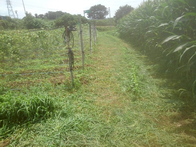 長梅雨の為雑草の伸びが速いです。第二圃場脇の草刈りをしました。台風対策として三方の脇に植えたソルゴーが目立つように他の雑草を刈取りしました。