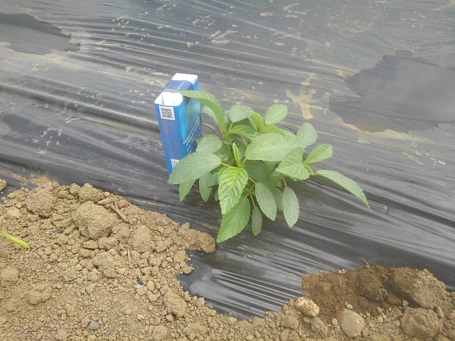 5月13日に定植したモロヘイヤがやっと大きくなりました。モロヘイヤは発芽率と活着率が悪く、これまで3回の補植を行ってきています。最近定植した苗を葉まだ小さいです。