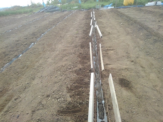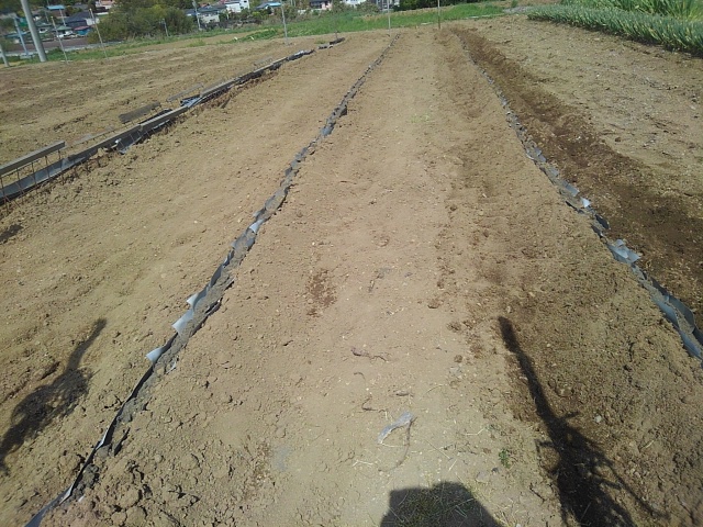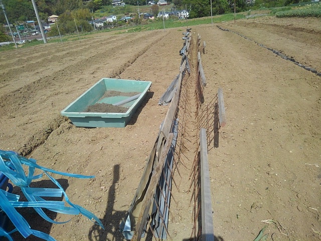 いよいよ畦シート埋めです。これが一番骨のいる作業です。まず第四圃場からスタートです。畦シートに山砂を入れて溝に埋めます。先頭を20cmずらせて次の畦シートを埋めて行きます。この圃場には1畦に約100個の畦シートを埋めます。