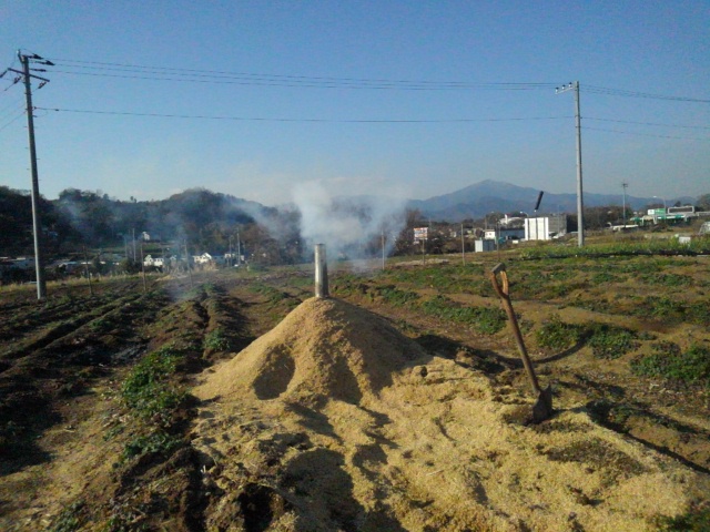 自然薯を掘りあげてしまった第四圃場で米殻の燻製を始めました。この燻製を畑にばらまいて耕作するとセンチュウなどの病害の予防に役立ちます。