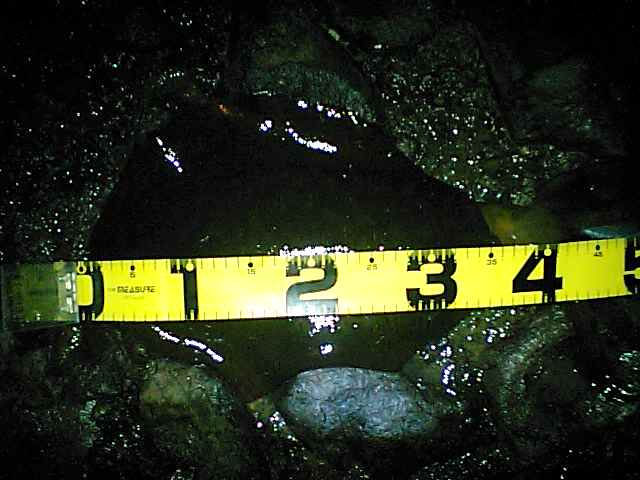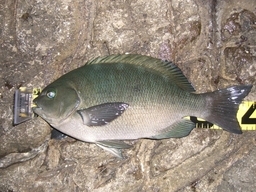 最初は鬼のような藻を根こそぎ引っ張ってきちゃったかな?っと思いましたが徐々に奴さんも気付いたようでジェッツ開始!ロッドは満月のまま下へ下へと絞ったドラグがギュ!ギュ!と出て行きます。今までに味わったことの無い重みにコリャ〜デケーぞって思いつつ・・・じわりじわりと巻き上げてくると沖で月光に照らされた物体がボワンッ!と浮いてきました。