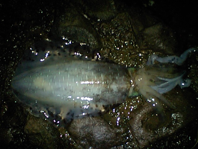 近くまで寄せると確実に自己記録更新サイズ・・・っが、ギャフ忘れた(爆)どーすんだよ〜(泣)とあたふたしましたが寄せ波に乗せて一段下の磯際にズリ上げ成功!次の波が来ないうちにウリャ〜っとイカの首根っこ鷲づかみにしてランディング成功!(爆)