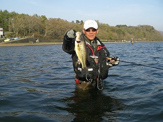 いよいよの時間が近づくとJUNPINさん起床。皆さん横一列に並んでシェイクするもしば〜らく沈黙。ふと風が止み、JUNPINさんが「あっ!湖流が変わった!」っと言ったか言わないかのうちに軍曹のロッドがいきなり引き込まれドラグが「ギュギュギュー!」最初は髭さんかな〜?なんて思っていると一瞬ジャンプ。バスです!しかもネイティブ良型君@44センチ。「やった〜!」と思いつつ慎重にズル引きランディング(笑)