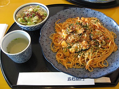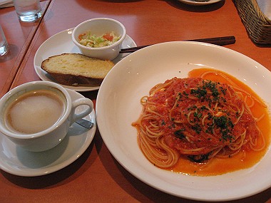 集まったメンバーは、主賓のくんこたさん、鈴江さんとアモ君、ジェナママ、COCOママ、こたままの6名! それぞれランチメニューから、パスタランチをオーダー! 因みに、こたままは「モツァレラチーズとバジルのトマトソースパスタ」〜♪(写真右) あとの5人は同じもので、「海老と菜の花じゃがいものジェノベーゼパスタ」〜♪ アモ君とふたりで一人前の鈴江さんは、パスタは大盛りに〜☆ そして連日、引越しの荷造り疲れでカロリーを消耗しているくんこたさんも、大盛りに〜〜!(^^)