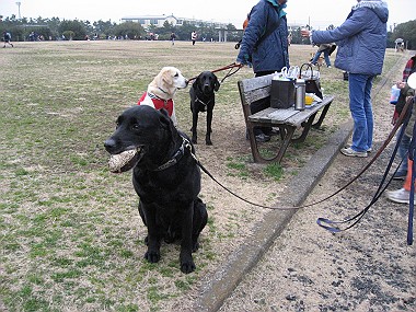 レナ&パパ、ちょこ&パパ、ルパン&パパ、ナビちゃん一家、 そしていつの間にか、湘南おじさんが登場! きょうは、シンディちゃんはお留守番のもよう・・・ ジェナママに、テニスボールの差し入れ〜! COCOママもやっと到着! 空模様が怪しいので、早めにコーヒータイム〜☆