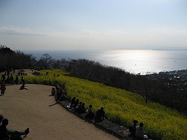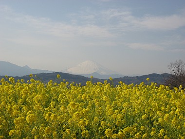 10分くらい歩いたでしょうか! 目の前が開けて、広〜い芝生広場に到着! 薄くかすんでいましたが、富士山も見え、明るい陽射しに きらきらと輝く相模湾を臨む丘に、目指す菜の花畑が!! なんと綺麗な光景〜☆ 青空と富士山と海と黄色い菜の花畑〜! 文句のないロケーション!