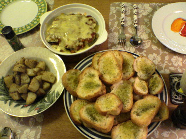じゃがいものガーリック&アンチョビソテー、ガーリックパン、 クラムチャウダー、ペンネアラビアータ、 そしてCOCOママの、なすのミートグラタン!!
