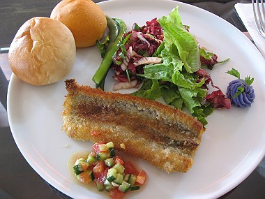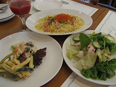 6人は、中央のいちばん大きなガラスのテーブル席へ〜 『気まぐれランチコース』1500円で予約していましたが、 メインのお肉は、「豚しゃぶのおろし和え」 お魚は「穴子のレモン風味フライ」〜♪