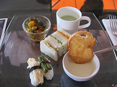 興味津々で玄関を入ると、そこはまさしくレストラン!!@@ 普通のお宅のリビングと思しき空間に、 素敵なテーブルと椅子が大小3席置かれ、テラスにも2席〜 明るいお部屋のいたるところに、素敵なお花が活けられ、 この雰囲気だけでも、十分くつろげ楽しめます〜♪