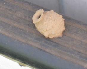 《写真》軽トラの荷台のあおり上部にできた巣。毎日乗っているのに、巣ができるのはなぜだろう。で、これは、何の虫(ハチ)?