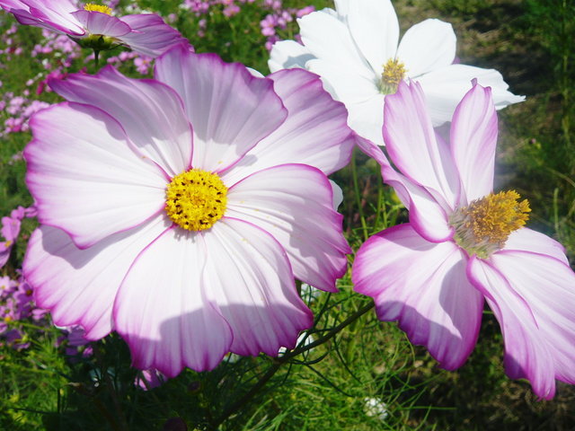 白、薄いピンク、濃いピンク、黄色と青空の下とても綺麗でしたよ