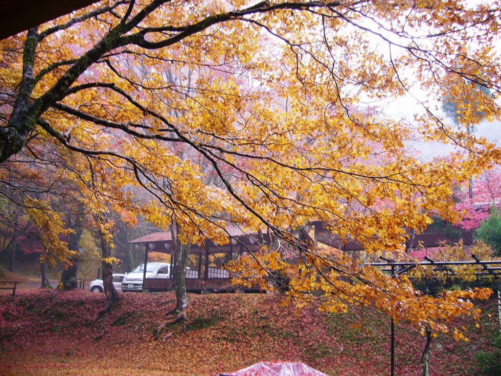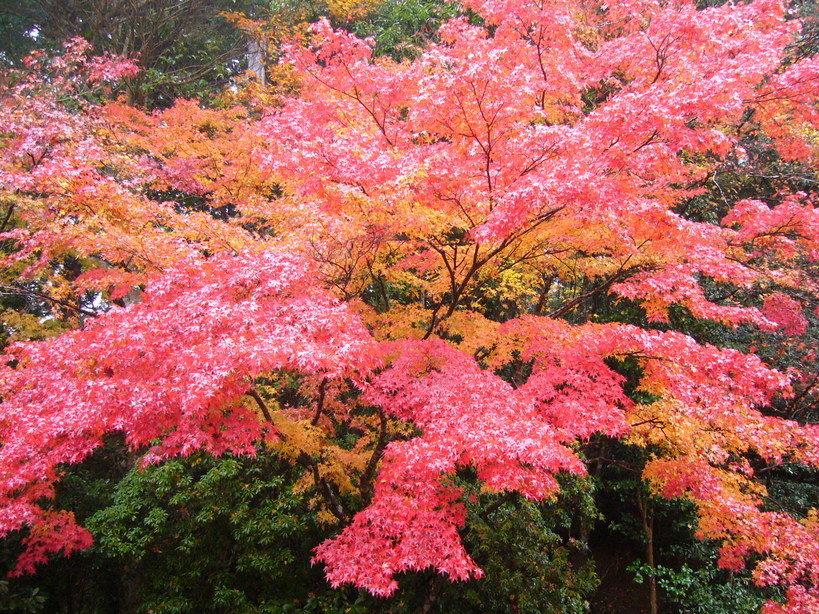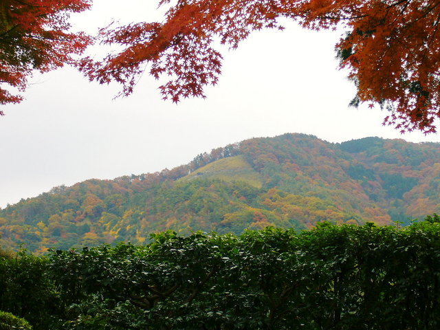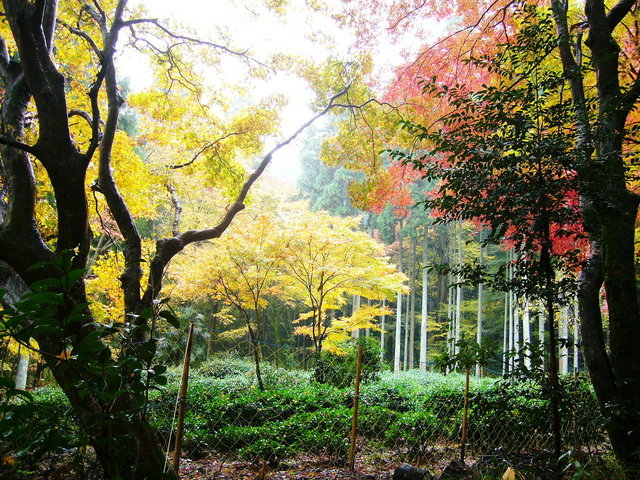 A 赤や黄色のもみじの下に、緑色のお茶の木が綺麗でした。