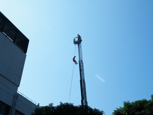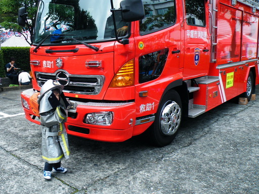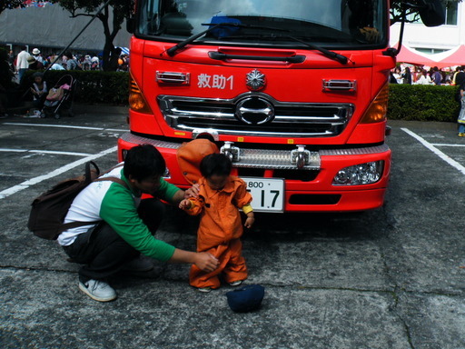 孫達は、消防士さんの防護服を着せてもらってご機嫌です