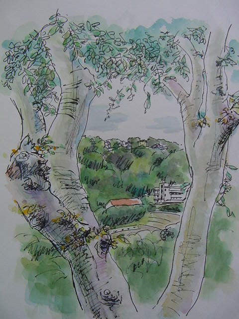 手が届くほど近い大木の間から見える景色を描きました。