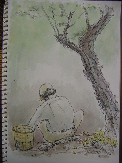 熟して落ちたたくさんの実を拾う作業は腰に来ます