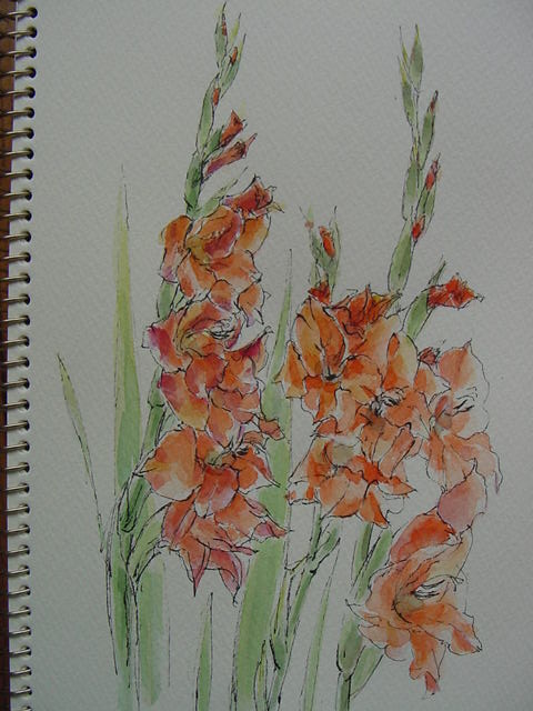 汗を拭き拭き 燃えるような色の花をスケッチ。