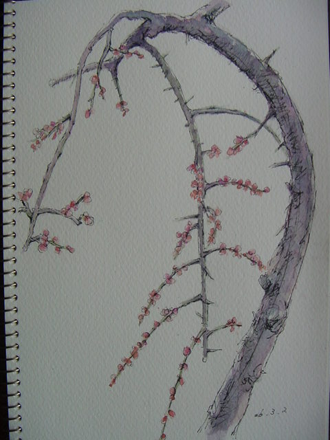 枝垂れ梅の紅の蕾が1つほころび始めた