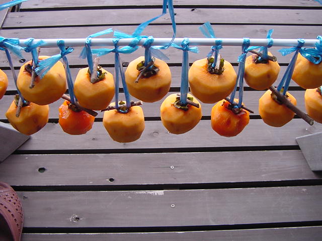 この柿は渋柿です。今年初めて実がいっぱい(とはいっても17個)なりました。