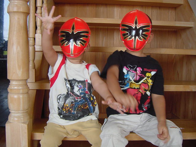 老人ホームの納涼祭でいただいたマジレッドのお面をかぶってマジレンジャーのシャツを着た上の孫と追いかけっこ。