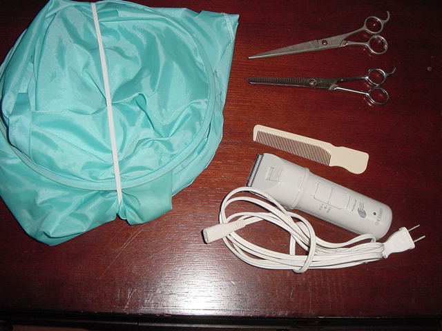 昔は 手ぬぐいと風呂敷二枚でカバーして切り落とした髪は新聞紙を敷いた床に。