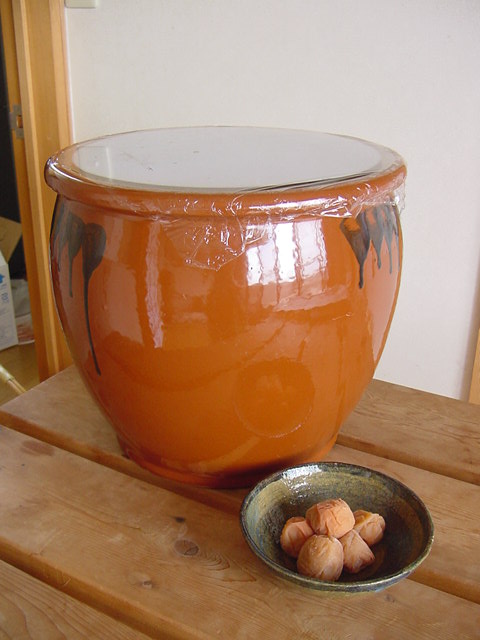 梅の熱いうちに甕にいれ日本酒少々振りかけて終了。
