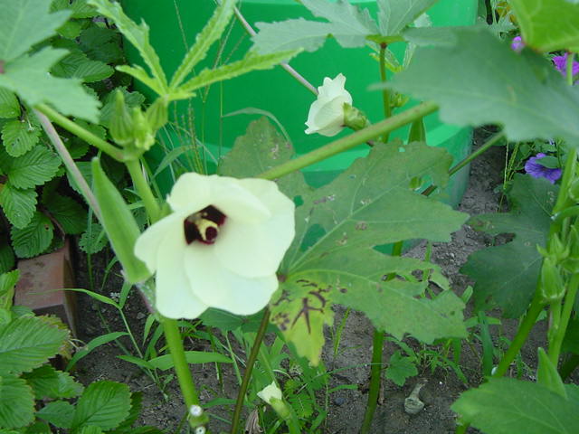オクラのクリームがかった黄色の花は踊りの衣装のように美しいのですが夕方にはしぼんでいました。