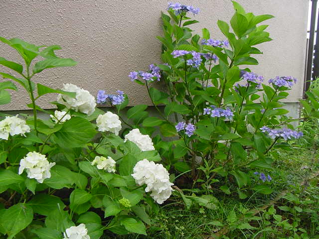 青いアジサイは7年程前、選定した枝を分けていただいたものを挿し木にしたもの・・涼しげな花です。