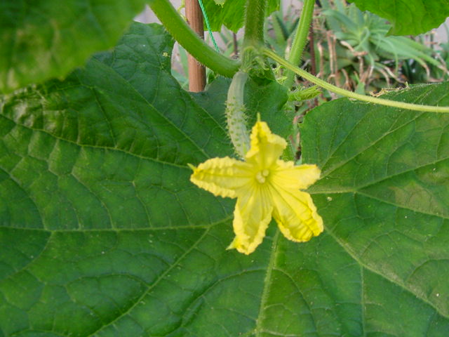 鮮やかな黄色い花の下にはきゅうりの赤ちゃん