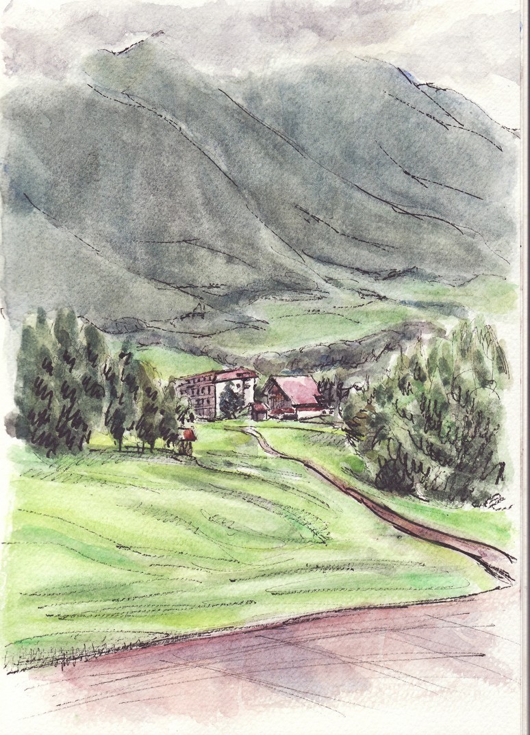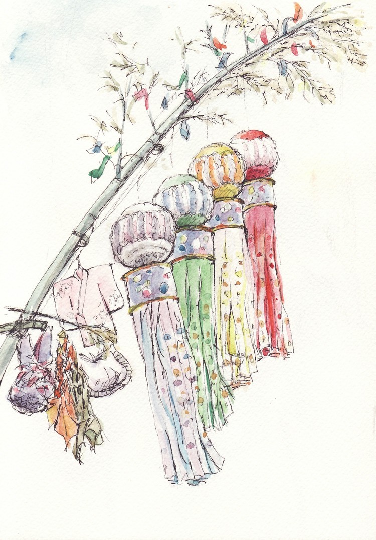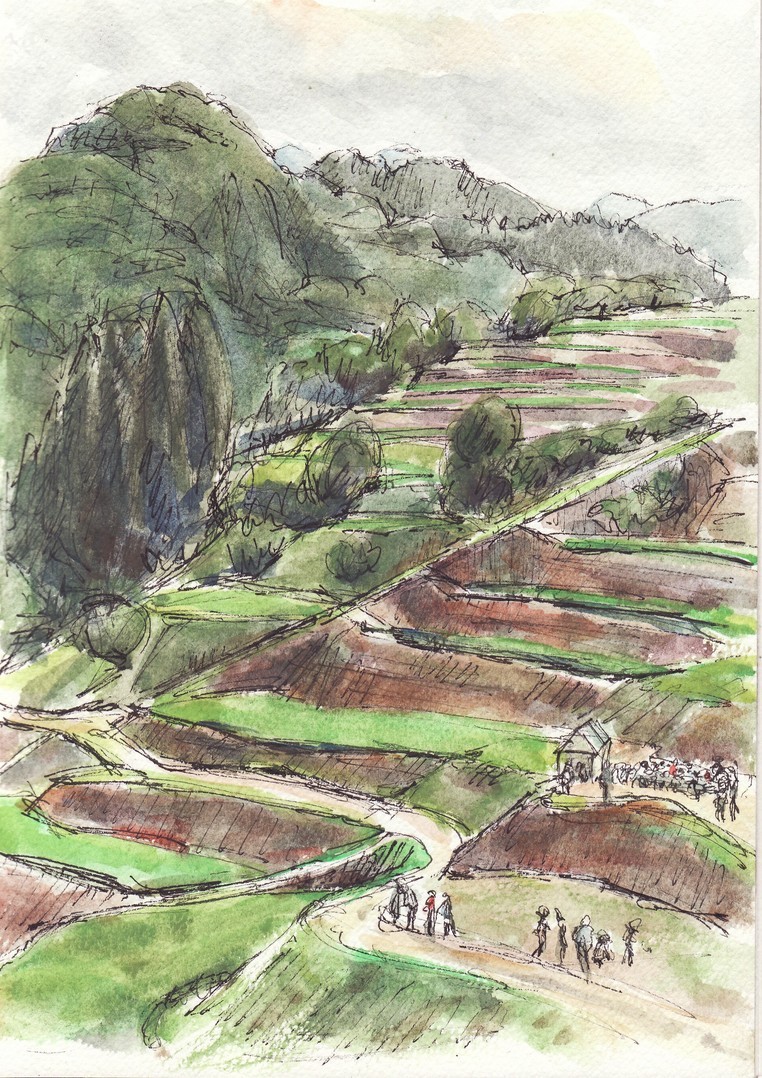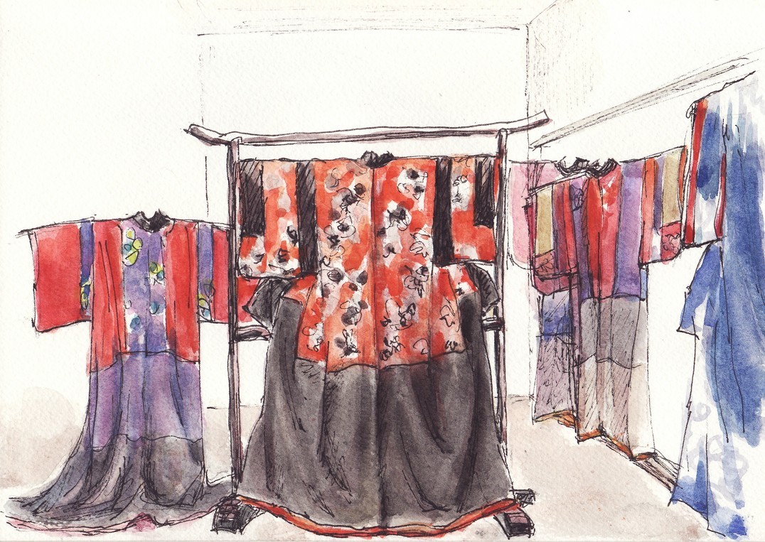最後に拝見させていただいたお宅でのこと。 じーじの一言で 「お玄関先でたくさん 虫干しされた衣裳をスケッチすることに」