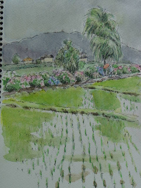 田植えが終わった田んぼを囲むように紫陽花が彩りを添える。