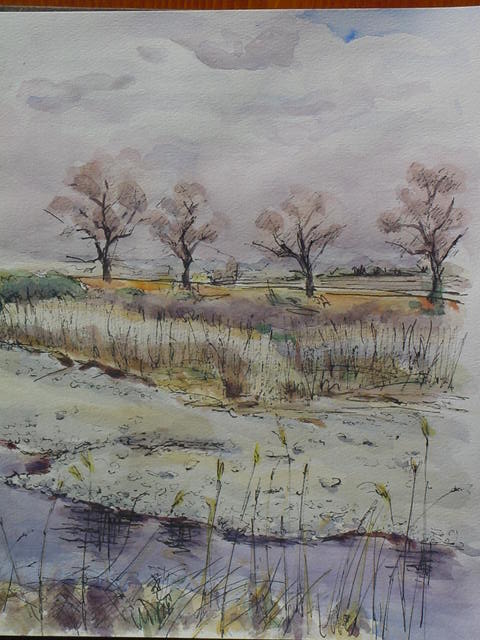 “新幹線”を越えたところで対岸をスケッチ。