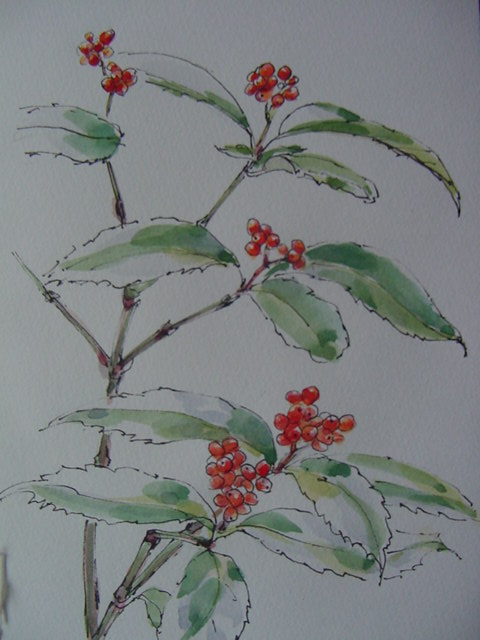小鳥がついばみ始めた千両の赤い実。