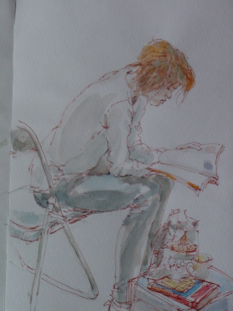 友人のアトリエで本を読み始めた青年に
