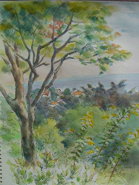 海の見える休憩所でモミジの枝先に“秋”を見つけました。
