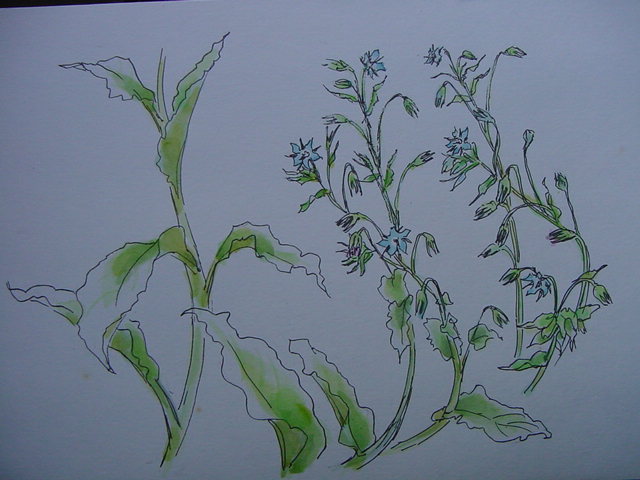 春に咲いたボリジの花の種がこぼれ発芽して大株に育ち