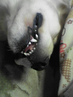 気持ち良さそうに へそ天状態で大爆睡中のミッキー君。その横でなぜかスイッチが入って遊び始めたガクト君。遊ぼうのサインに寝返り打って嫌だってミッキー君。なんどか誘っても相手にしてくれそうも無い、玄関のほうへワイワイ どたばた ぬいぐるみ持っていったと思ったら全力で戻ってきていきなりミッキーの上についでに首の所をガブ〜ッ… ビックリして飛び起きて何?何があったの?って感じでキョトンとしているミッキー君。