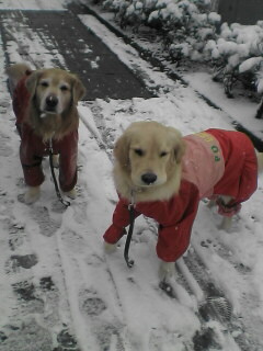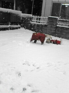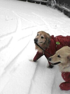 朝の忙しい時に何度も外に以降とせがむミッキー、今度は父がお子が順番にお付き合い。お子を駅まで送る車の中で外をじーっと見ている。何時もの公園を通るとここで降りるって駄々こねたミッキー。山にキャンプに行く途中川を見るとここで遊ぶって騒ぐ時と同じ。家に着くとがっかりモードのミッキー、しょうがないのですぐお散歩に。何時もは引っ張らないミッキーがぐいぐい引っ張る。早く行きたいのは分るけど危ないでしょうが。母に一喝され我に戻ったようにいい子に歩く。ガクトは初雪、不思議そうに空を見たり雪を食べたり、いきなりゴロ〜ンてしたり。公園は勘弁してもらって近所の駐車場に立ち寄った。ミッキーのワイワイにガクトも楽しそう。