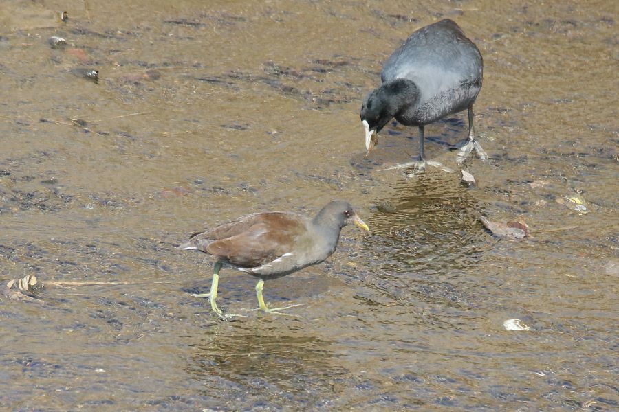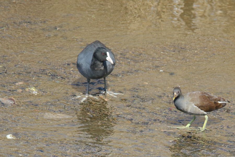 川を覗いてみたら、「バン」と「オオバン」が仲良く行動していた。珍しい風景だったのでシャッターを切った。